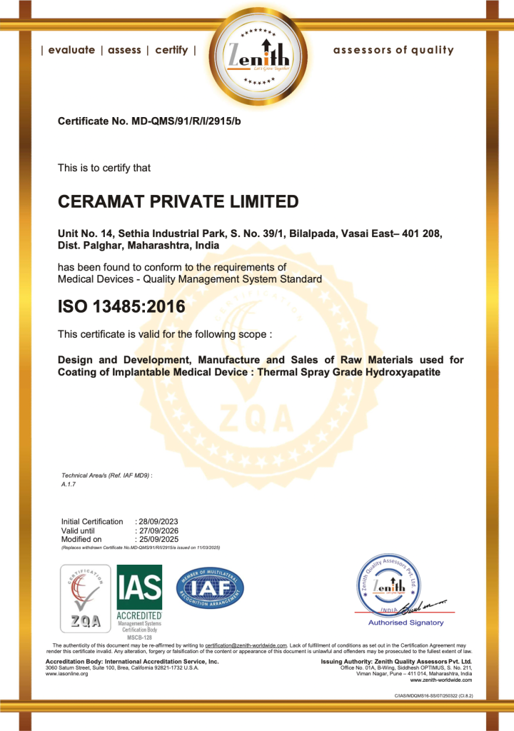 CERAMAT has implemented a Quality Management System and is certified by Zenith Quality Assessors Private Limited according to ISO13485:2016 standards within the realm of producing Thermal Spray Grade Hydroxyapatite. Our commitment to continuous improvement in both process and product development is reflected in the robust Quality Management System we have established. This system is integral to CERAMAT’s strategic direction, aligning with key concepts and guiding principles.
